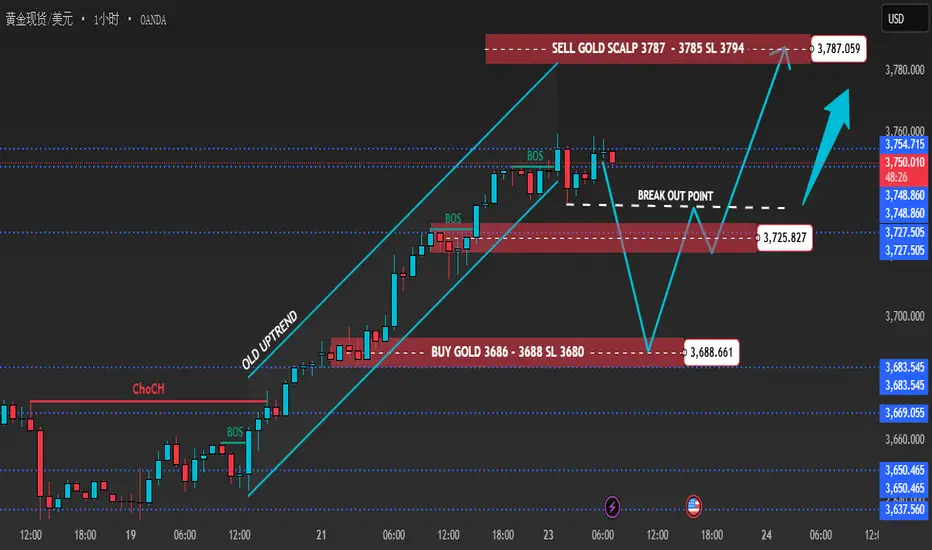 黄金在 1H 图上运行在 3,753 附近,经过多次 BOS 确认后维持强劲的多头结构,但正逼近高位阻力。流动性集中在 3,787–3,785 上方,而买入需求区则位于 3,725–3,723 以及更深的 3,688–3,686。