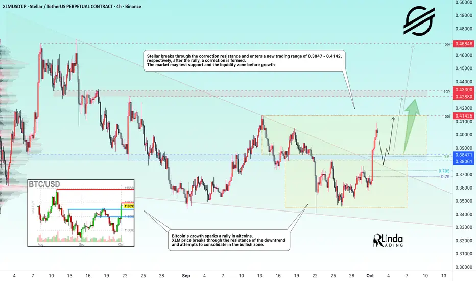 Stellar is breaking through the resistance of the correction and entering a new trading range of 0.3847 - 0.4142, respectively, after the rally, a correction is forming. The market may test support and the liquidity zone before rising.
