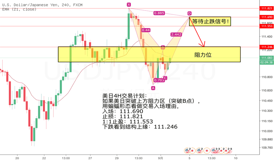 美日4小时图日前走了一个非常标准的看空蝙蝠,顺利的捕捉了这波百点的下跌;