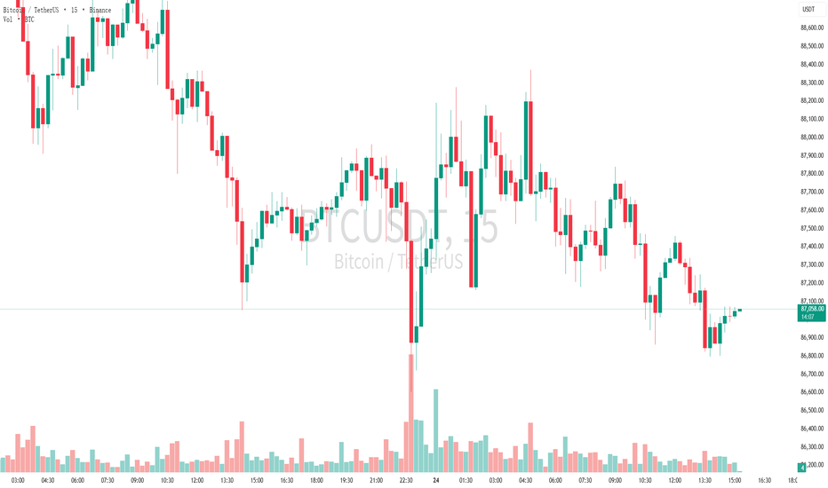 短期(15m, 1h): 处于下跌趋势,形成持续的低点和低高点。关键阻力位在87300-87500美元,下方支撑关注86800美元。若跌破86800,可能加速下跌。目前无明显反转形态,继续看跌。