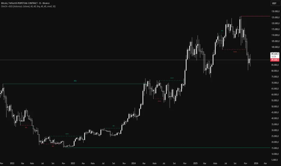 Identifies Break of Structure (BOS) and Change of Character (CHoCH) in real-time. Displays swing and internal market structure with configurable alerts.