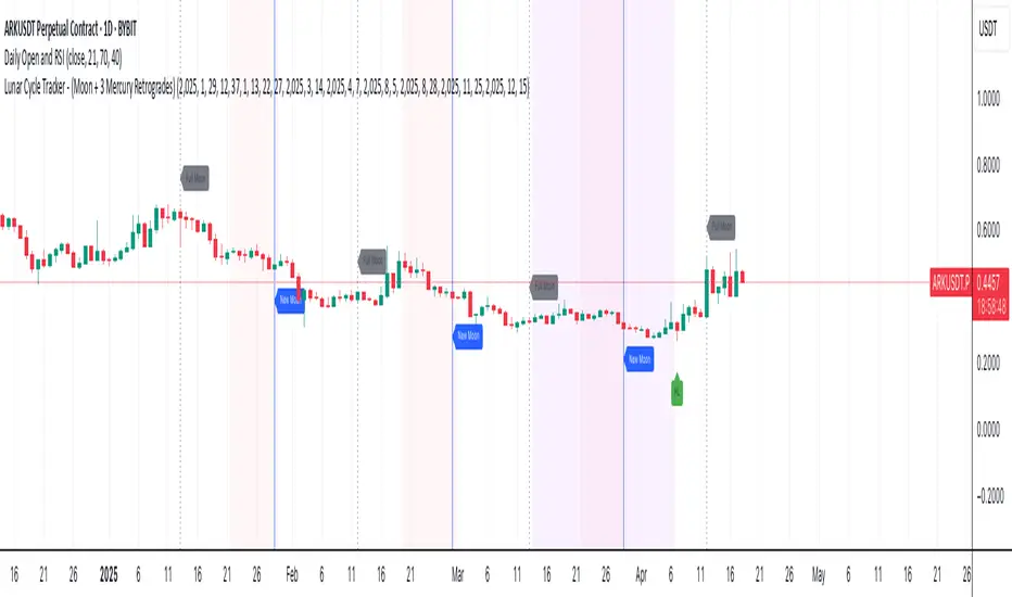 This script overlays the lunar and Mercury retrograde cycles directly onto your chart, helping traders visualize natural timing intervals that may influence market behavior.