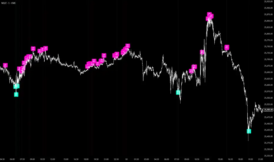 Sell Signal (▼): A bearish order flow imbalance with downward momentum acceleration at a short-term high.