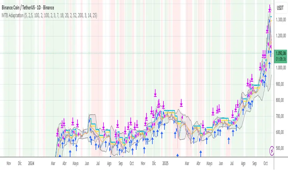 Description of the "MTB Adaptation" StrategyMy strategy is a trend-following trading system with intelligent DCA (Dollar Cost Averaging), designed to trade daily timeframes in a wide range of cryptocurrencies. Its objective is to capitalize on large market movements, entering when an uptrend is strongly confirmed and exiting when it shows the first signs of exhaustion.
