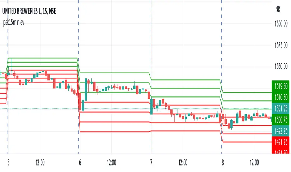 This indicator plots 15 minute high low values . It also plots 15 minute range mid point and other levels.