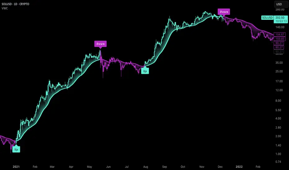 The Volatility Weighted Cloud (VWC) is a trend-tracking overlay that combines adaptive volatility-based bands with a multi-source smoothed price cloud to visualize market bias. It provides users with a dynamic structure that adapts to volatility conditions while maintaining a persistent visual record of trend direction. By incorporating configurable smoothing techniques, percentile-ranked volatility, and multi-line cloud construction, the indicator allows traders to interpret price context more effectively without relying on raw price movement alone.