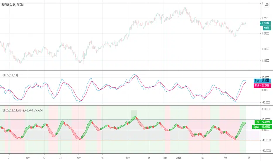 User request. A tuned version of the built-in True Strength Index (TSI) indicator with the following options included: