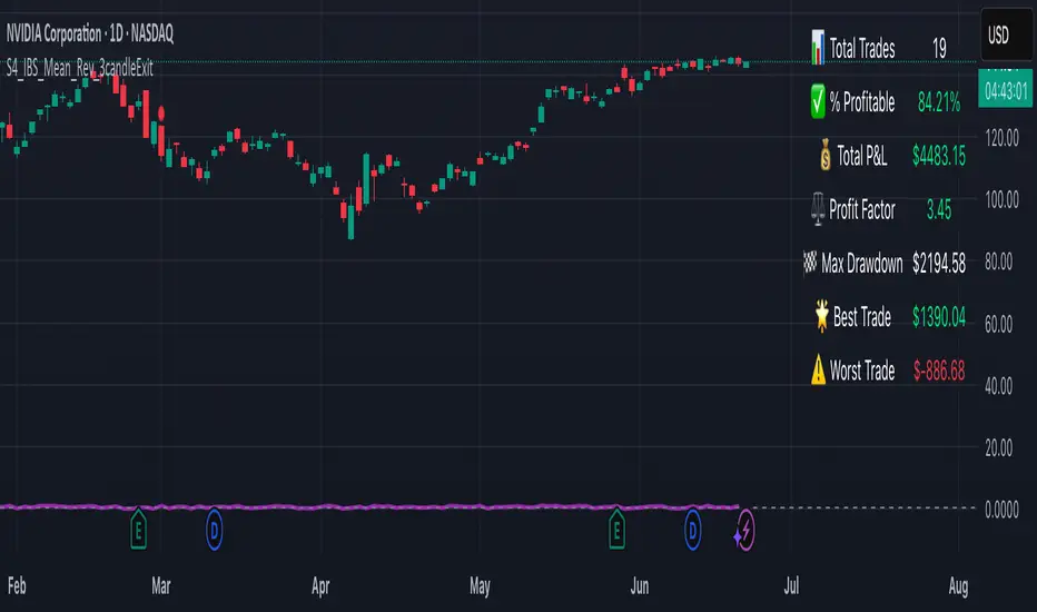 This is a rules-based, mean reversion strategy designed to trade pullbacks using the Internal Bar Strength (IBS) indicator. The system looks for oversold conditions based on IBS, then enters long trades, holding for a maximum of 3 bars or until the trade becomes profitable.