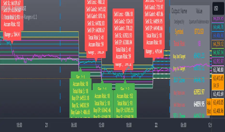The Quantum Duality Predictive Ranges indicator by QuantumTradeInnovator is designed to provide predictive ranges for trading, based on advanced ATR calculations and risk management strategies. This update includes several new features and improvements: