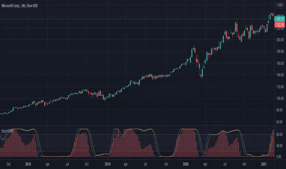 Stochastics applied to adjusted ADX to represent the trend direction. DM based sub-indicators added to hint the momentum and changes in the ADX.