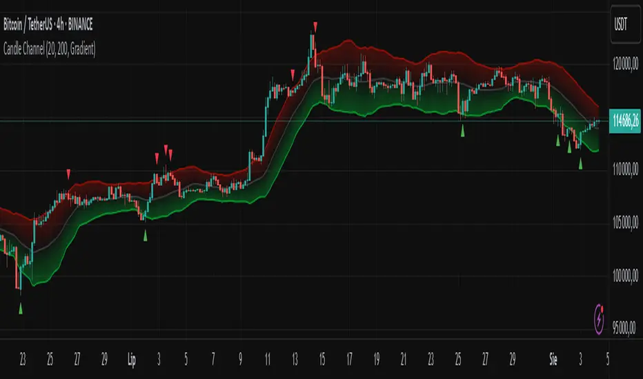 The "Candle Channel" indicator is a versatile technical analysis tool that plots a price channel based on the Simple Moving Average (SMA) of candlestick midpoints. The channel bands, calculated based on candlestick volatility, form dynamic support and resistance levels that adapt to price movements. The script generates signals for reversals from the bands and SMA breakouts, making it useful for both short-term and long-term traders. By adjusting the SMA length, the channel can vary in nature—from a wide channel encapsulating price movement to narrower support/resistance or trend-following bands. The channel width can be further customized using a scaling parameter, allowing adaptation to different trading styles and markets.