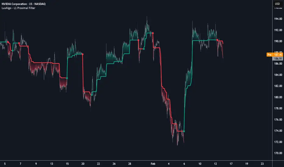 The Proximal Range Filter indicator provides a robust range/noise-filtering solution that utilizes an L1 soft-thresholding approach to determine market trends while minimizing lag and erratic price movements.
