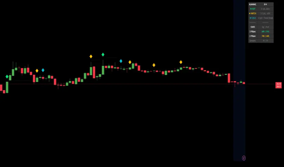 The indicator continuously monitors four key market components and tracks historical outcomes when multiple pillars align. When conditions meet your probability threshold, visual signals appear on the chart.