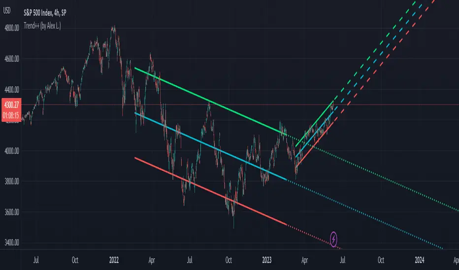 This indicator seeks for a short term trend within a bigger long term trend and displays both in a channel with an extension lines (optional).