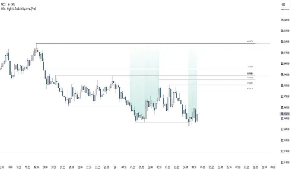 HIPA (High IRL Probability Areas) visualizes statistically derived Internal Range Liquidity (IRL) zones — price areas that have historically shown a higher tendency for revisit or interaction within an intraday session.