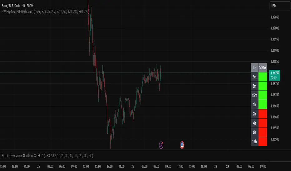 This script is a Multi-Timeframe Flip State Dashboard based on Nadaraya-Watson: Rational Quadratic Kernel (Non-Repainting) indicator. It visualizes trend "flip" states across up to 8 custom timeframes using a consistent, non-repainting methodology. Built on 1-minute data, each timeframe row in the table updates only after its bar fully closes, ensuring accuracy and eliminating repainting issues.