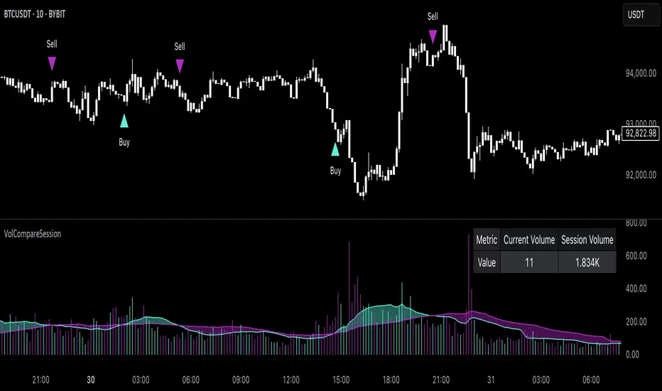 A session tracking feature monitors cumulative daily volume and resets at the start of each new day. This is useful for intraday traders who want to gauge the overall activity within a single trading session. The script also includes a real-time table showing key metrics like current volume and session volume totals.