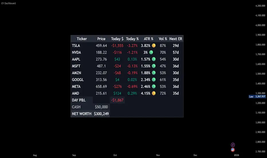 The Easy Portfolio Dashboard is a high-performance, real-time monitoring tool designed for traders managing multiple positions. Unlike standard tables, this script is optimized using User-Defined Types (UDT) and Array-based rendering to ensure the lowest possible latency and 100% compliance with TradingView’s security-call limits. It allows you to track up to 24 symbols simultaneously, showing price action, volatility (ATR), relative volume, and upcoming earnings.