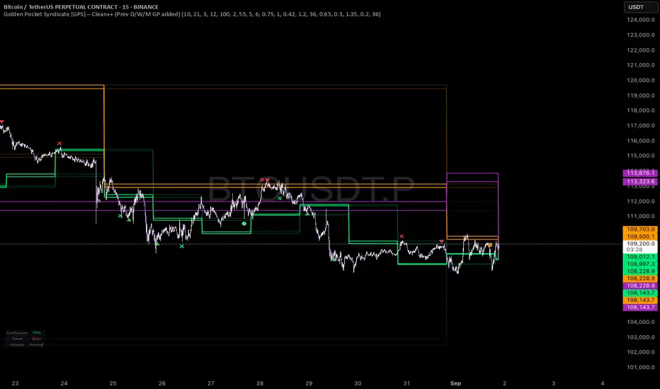 Golden Pocket Syndicate [GPS] is a multi-layered market analysis toolkit built for precision entries and sniper-style reversals in both trending and ranging conditions. The script fuses volume dynamics, golden pocket structures, market maker behavior, and liquidation cluster tracking into one high-confluence system.