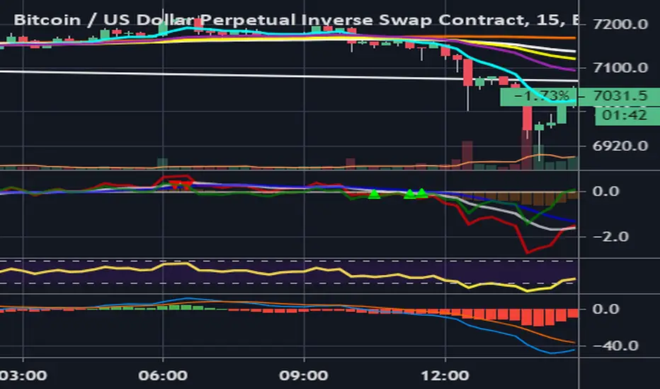 Indicator is similar to RSI, but isn't range bound (no maximum or minimum). Buy or sell signals are recognized, when connecting line of vertexes on the red line diverge with connecting line of vertexes on the green line. White line is lagging trend line (like MA). When it is above zero axis, it is signaling uptrend and vice versa. The strength of trend is measured by how the red line sustain above the white line and how often the two cross. Indicator can be used on all timeframes, but the higher the timeframe, the stronger the signal with less noise and the greater is the expected move. For example when there is a signal to sell on 1D, 12h and 8h timeframes, it is best to look for good entry signals on 1h, 30m and 15m. On small timeframes (1m - 5m) it works very well during high volatility and high volume periods. During low volume periods there is more noise.