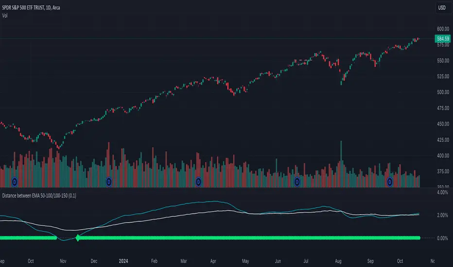 1. EMA Calculation: The script computes the EMA values for 50, 100, and 150 periods and calculates the percentage difference between EMA 50 and 100, and between EMA 100 and 150.