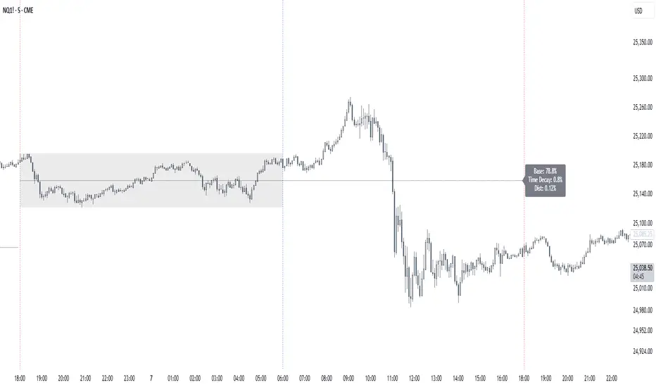 This advanced indicator is specifically designed for NQ futures traders who trade the overnight session (18:00 ET to 6:00 AM ET) and the subsequent day session (6:00 AM to 18:00 ET). It draws vertical lines at key session times, visualizes the 12-hour overnight range with a box, plots the midpoint of that range, and most importantly, displays real-time probability statistics for price retracing back to the 18:00 midpoint based on historical data.