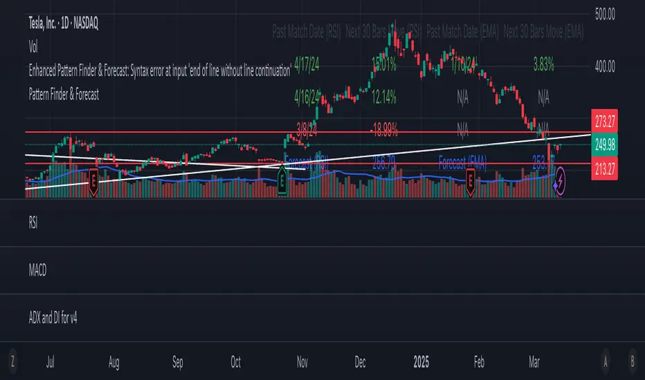 This script is a pattern-finding and forecasting tool that analyzes historical price data based on EMA (Exponential Moving Averages) and RSI (Relative Strength Index). It identifies past occurrences where the last 30 bars of data resemble the most recent 30 bars and predicts the future price movement based on those past patterns.