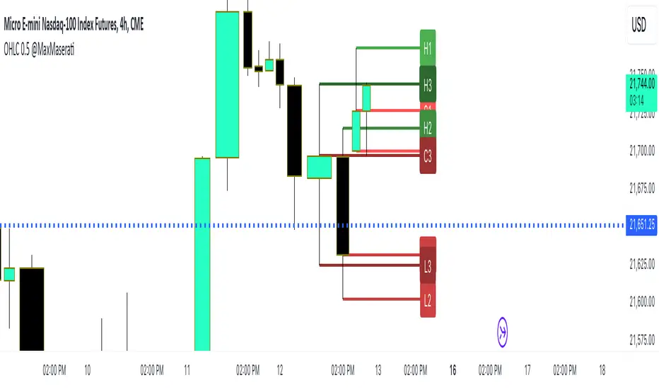 This indicator automatically put a straight line on the High, Low, Close, and Open and calculates the Consequent Encroachment or the midline (50%) of the previous candle. The calculation for the midline can be based on either the High and Low or the Open and Close. The option to disable OHLC labels is available. The indicator displays the premium and discount areas of the previous candle, allowing for a strategy of buying on discount and selling on premium based on each candle stick.