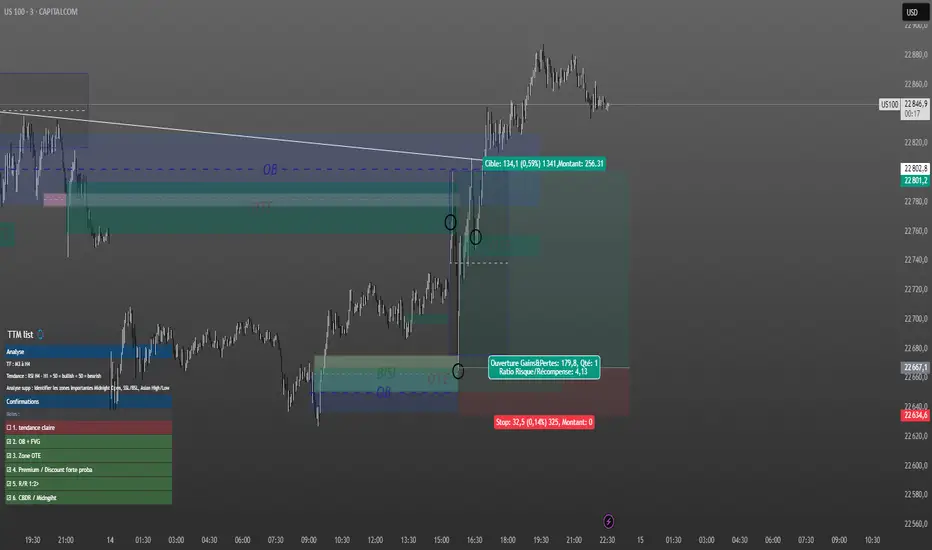 - Analysis : Reminders for your routine, such as timeframe selection (M3 to H4), trend analysis via RSI, and identification of key zones (Midnight Open, SSL/BSL, Asian High/Low).
