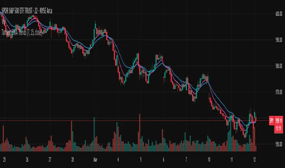 This indicator helps to identify trends using 2 (tandem) EMAs: a fast EMA and a slow EMA. Set the lengths of the EMAs in the inputs (fast EMA should be a smaller number than the slow EMA).