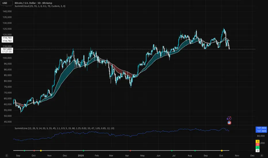The Summit Cloud is a clean, high-performance trend indicator that visually shows market direction using dynamic color shading. Built on a dual EMA foundation, it identifies bullish and bearish momentum with smooth, adaptive cloud transitions. Green indicates bullish strength, red signals bearish pressure, and neutral tones highlight consolidation zones. With customizable colors and simple tuning options, the Summit Cloud pairs perfectly with the Summit Line to confirm major reversals and trend continuations, offering traders a powerful yet minimalist way to stay aligned with the market’s flow.