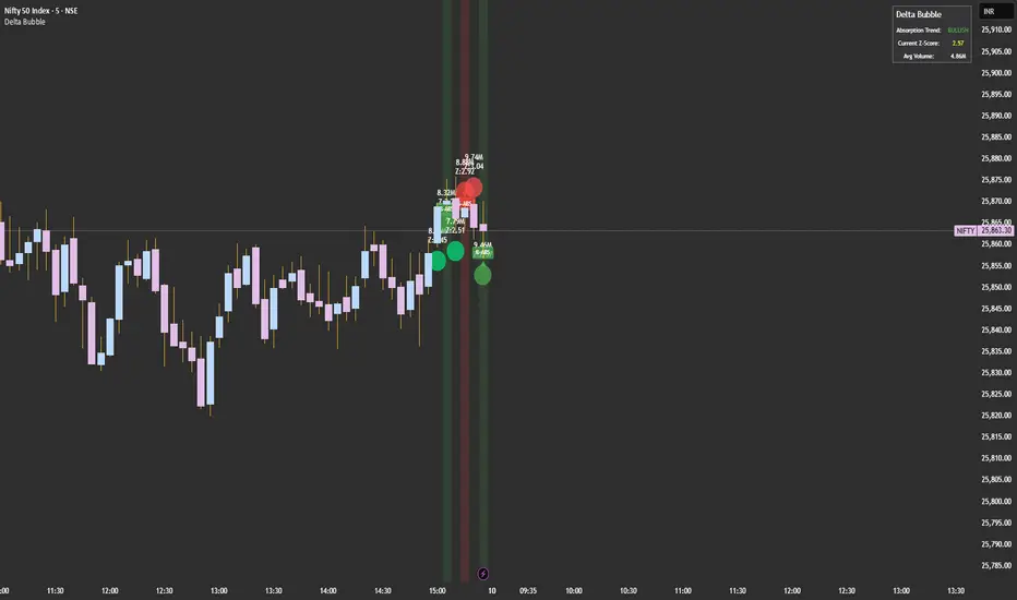 A sophisticated volume analysis tool that identifies unusual buying/selling pressure and detects absorption patterns in real-time. This indicator combines statistical volume analysis with smart price action detection to reveal hidden market dynamics.