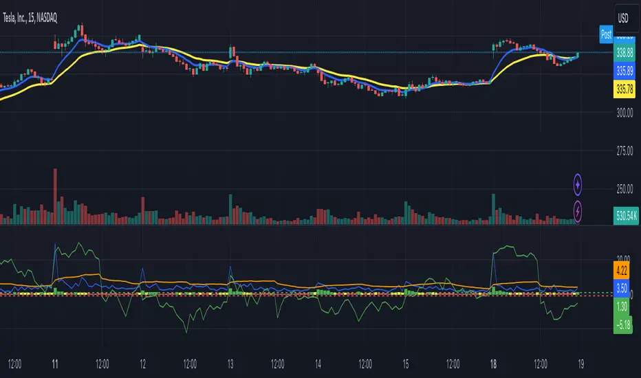 The updated Pine Script introduces dynamic enhancements for improved usability and visualization. The volume gauge is now dynamically scaled using the average volume over a user-defined lookback period, replacing the static divisor for broader adaptability across tickers. Additionally, dynamic bar coloring has been implemented, with thresholds for high, low, and normal volume levels. Users can customize these thresholds to highlight significant volume spikes (green), low-volume dips (red), and normal activity (yellow). These changes make the script more intuitive, adaptable to different markets, and visually informative, providing traders with clearer insights into volume dynamics alongside the existing volatility and momentum indicators.开源脚本
