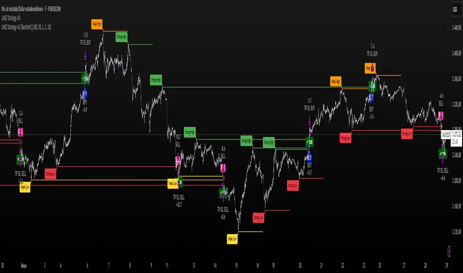 LANZ Strategy 4.0 [Backtest] is the official backtesting engine for the LANZ Strategy 4.0 trading logic. It simulates real-time executions based on breakout of Strong/Weak Highs or Lows, using a consistent structural system with SL/TP dynamically calculated per trade. With integrated risk management and lot size logic, this script allows traders to validate LANZ Strategy 4.0 performance with real strategy metrics.