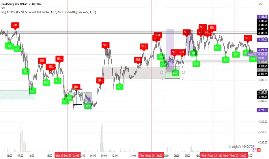 This indicator created by brightfx takes the previous U.S. regular trading session and maps its most actively traded price zone onto the next day. It draws a shaded boxbounded by VAH (Value Area High) and VAL (Value Area Low). A line through the middle marks the POC (Point of Control), the single price with the most traded volume. The box projects 24 hours into the new day so you can see where today’s action sits relative to yesterday’s “fair value.”