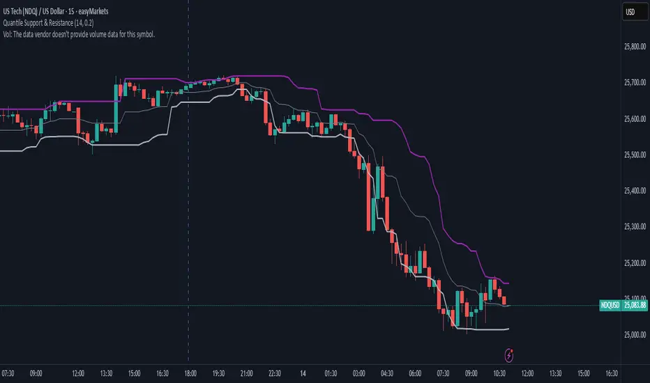 This indicator plots dynamic support and resistance zones based on quantile logic — a statistically grounded method for identifying structural price boundaries.