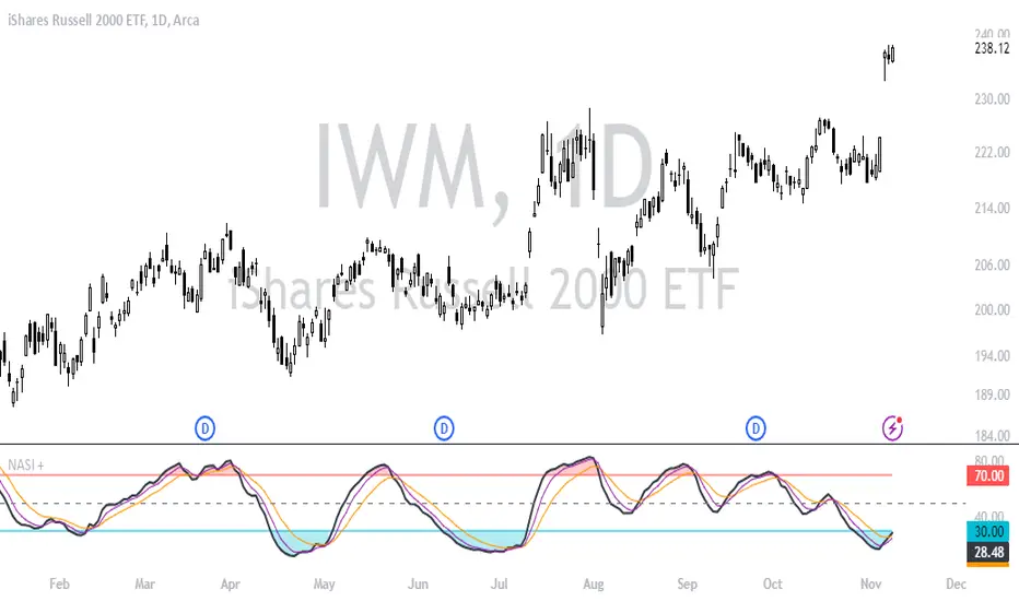 The NASI + indicator is an advanced adaptation of the classic McClellan Oscillator, a tool widely used to gauge market breadth. It calculates the McClellan Oscillator by measuring the difference between the 19-day and 39-day EMAs of net advancing issues, which are optionally adjusted to account for the relative strength of advancing vs. declining stocks.To enhance this analysis, NASI + applies the Relative Strength Index (RSI) to the cumulative McClellan Oscillator values, generating a unique momentum-based view of market breadth. Additionally, two extra EMAs—a 10-day and a 4-day EMA—are applied to the RSI, providing further refinement to signals for overbought and oversold conditions.