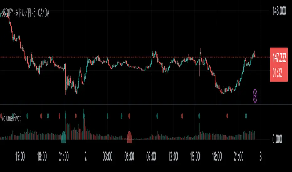 Volume Pivot is a technical analysis tool for TradingView designed to identify key turning points in the market by focusing on volume rather than price. It detects peaks and troughs (pivots) in trading volume to pinpoint moments of maximum market interest or exhaustion.