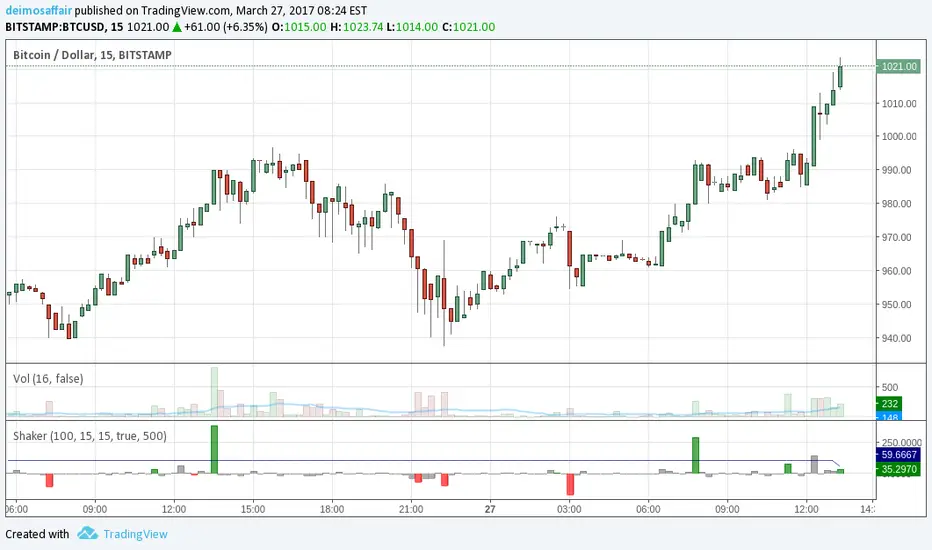 The market Shaker calculates the price differences, and weights them with the volume used for the move. This volume is not the plain value, but a measure of the past X volume candles.