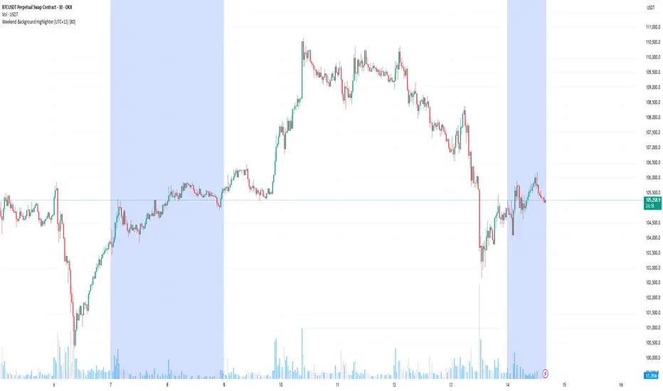 This indicator automatically highlights weekend periods on your TradingView charts specifically for the UTC+12 timezone (New Zealand Standard Time). Perfect for traders who need to visualize market closures and weekend gaps in the New Zealand/Pacific time zone, regardless of their exchange's native timezone or chart settings.