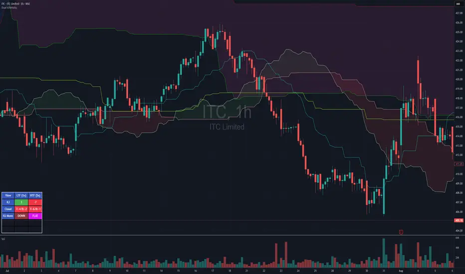 Dual timeframe Ichimoku cloud (1x - Lower Timeframe & 5x - Higher timeframe). Higher timeframe trend can be identified in the same chart.