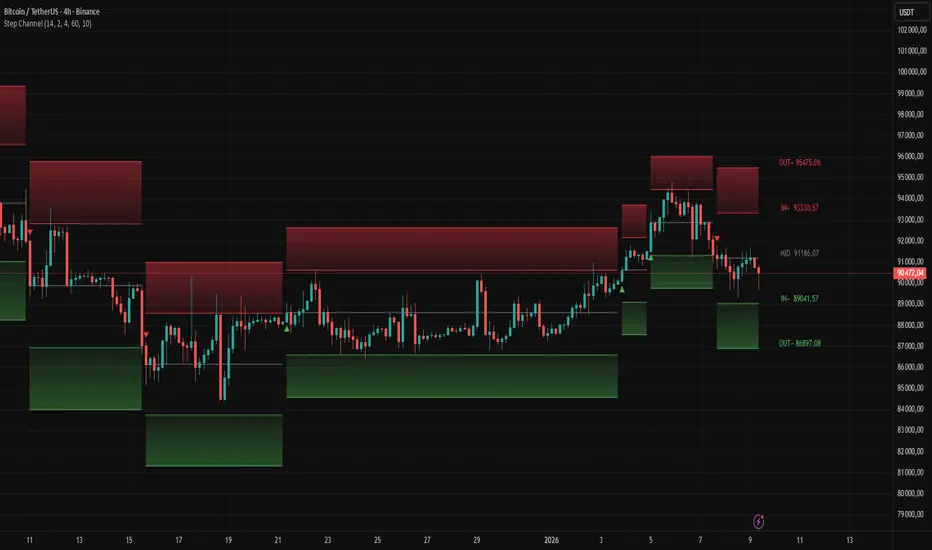 "Step Channel" is a technical analysis indicator that builds a dynamic price channel based on market volatility (ATR) and a step-like logic for updating levels. It is ideal for traders using market structure analysis, price action, as well as trend-following, range-bound, and breakout strategies.