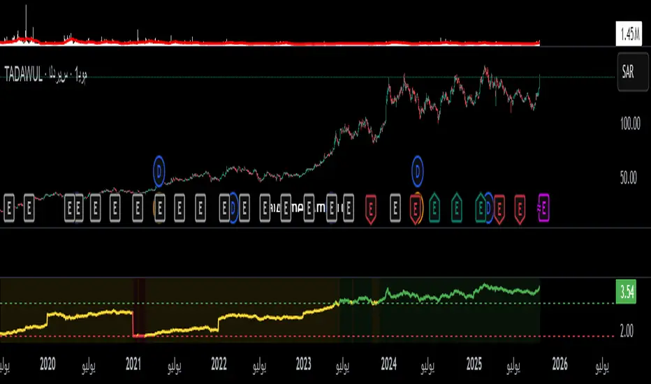 Symbol (الرمز): يمكنك ترك هذا الحقل فارغاً ليقوم المؤشر بتحليل السهم الحالي على الرسم البياني تلقائياً. أو يمكنك إدخال رمز سهم آخر (مثلاً `AAPL` أو `MSFT`) لتحليل تلك الشركة ومقارنتها بالشركة الحالية.