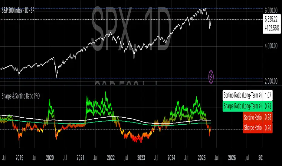Sharpe & Sortino Ratio PRO offers an advanced and more precise way to calculate and visualize the Sharpe and Sortino Ratios for financial assets on TradingView. Its main goal is to provide a scientifically accurate method for assessing the risk-adjusted performance of assets, both in the short and long term. Unlike TradingView’s built-in metrics, this script correctly handles periodic returns, uses optional logarithmic returns, properly annualizes both returns and volatility, and adjusts for the risk-free rate — all critical factors for truly meaningful Sharpe and Sortino calculations.