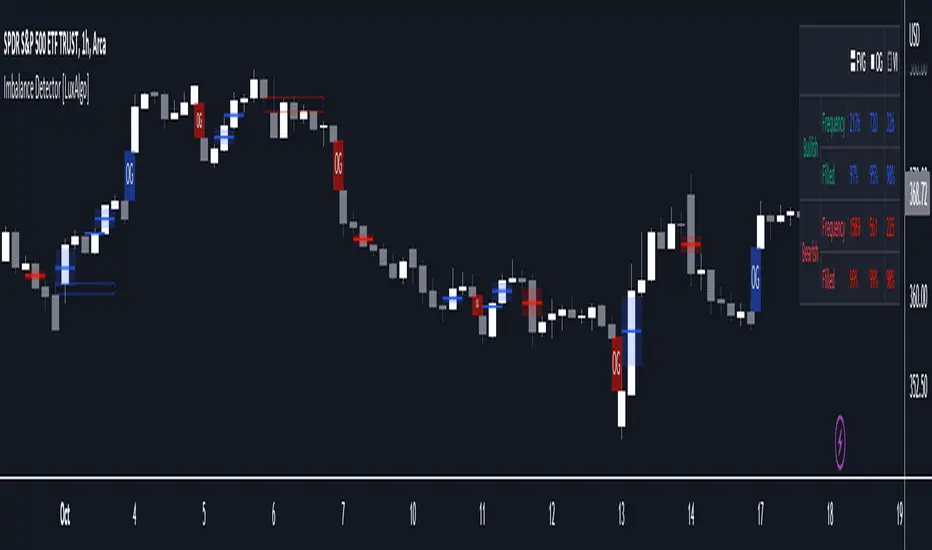 This indicator detects and highlights market imbalances alongside a dashboard returning information about their frequency of occurrence and their fill percentage. Imbalances included in this script are Fair Value Gaps (FVG), Opening Gaps (OG) and Volume Imbalances (VI).