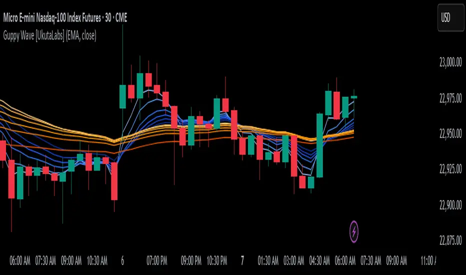 The Guppy Wave is generated using a series of 12 total Moving Averages composed of 6 Small-Period Moving Averages and 6 Large Period Moving Averages. By measuring the position of each moving average relative to the others, this script provides unique insight into the current strength of the market.