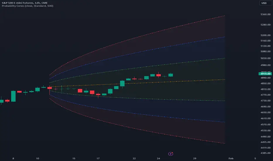 A probability cone is an indicator that forecasts a statistical distribution from a set point in time into the future.