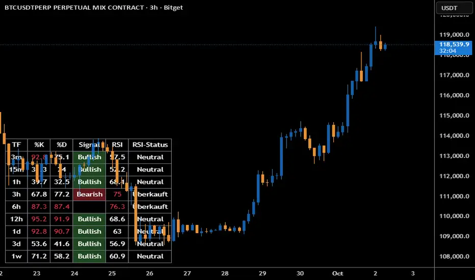 MTF Stochastic + RSI Dashboard FLEX with STRONG AlertsA compact, multi-timeframe dashboard that shows Stochastic %K/%D, RSI and signal states across user-defined timeframes. Columns can be toggled on/off to keep the panel as small as you need. Signal texts and colors are fully customizable. The table can be placed in any chart corner, and the background color & opacity are adjustable for perfect readability.