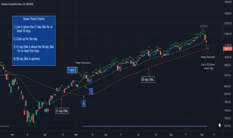 For example, you can create an Alert on the Nasdaq Composite that will send a message whenever the requirements for a Power Trend are met. Given TradingView alerts are stored server-side, you can be on notified even if you are not currently running TradingView.
