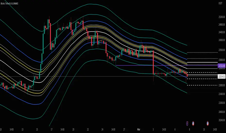 Bollinger Band Mod fits the standard deviation on both sides of the center moving average ( ALMA +/- stdev / 2 ) and calculates Fibonacci ratios from stdev on both sides.